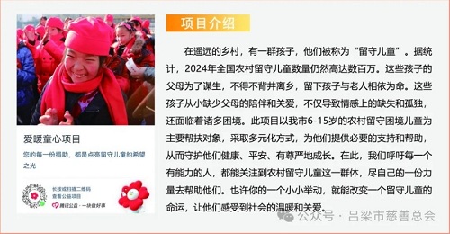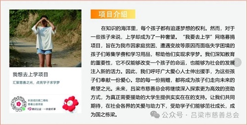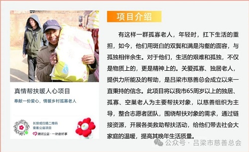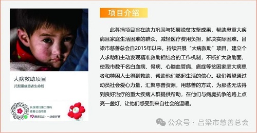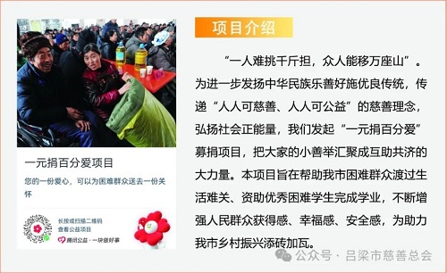 黨的二十大明確指出,要引導、支持有意愿有能力的企業、社會組織和個人積極參與公益慈善事業。黨的二十屆三中全會《決定》中也著重強調:“支持發展公益慈善事業。”為積極響應國家關于慈善事業發展的號召,深入貫徹《慈善法》精神,進一步弘揚中華民族扶危濟困、樂善好施的傳統美德,呂梁市慈善總會結合2024年“第九個中華慈善日”、第四個山西省慈善宣傳周及“騰訊99公益日”等特殊節點,籌劃了“大病救助”、“愛暖童心”、“私人訂制助殘服務”、“一元捐百分愛”、“真情幫扶暖人心”、“我要去上學”六個互聯網募捐項目,旨在通過網絡籌款平臺,匯聚社會各界愛心力量,為我市貧困家庭、孤寡老人、殘障人士、困境兒童等弱勢群體提供精準幫扶,助力他們改善生活條件,共享社會發展成果,共同構建幸福美麗呂梁。