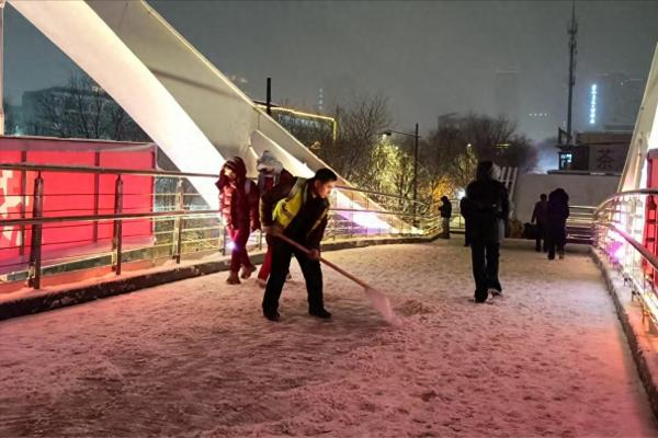 當被問及姓名時,這群身著藏藍色制服的工作人員只是笑著回應,他們是大同市城管局的工作人員,此次清雪是下班后的自發行動,只是想做些力所能及的事,姓名并不重要。紛飛的雪花落在他們的肩頭,藏藍色的制服上積起層層白雪,遠遠望去,宛如一朵朵綻放在寒夜里的 “守護之花”。原本清冷的天橋,在他們的忙碌身影中,漸漸匯聚起濃濃的暖意。